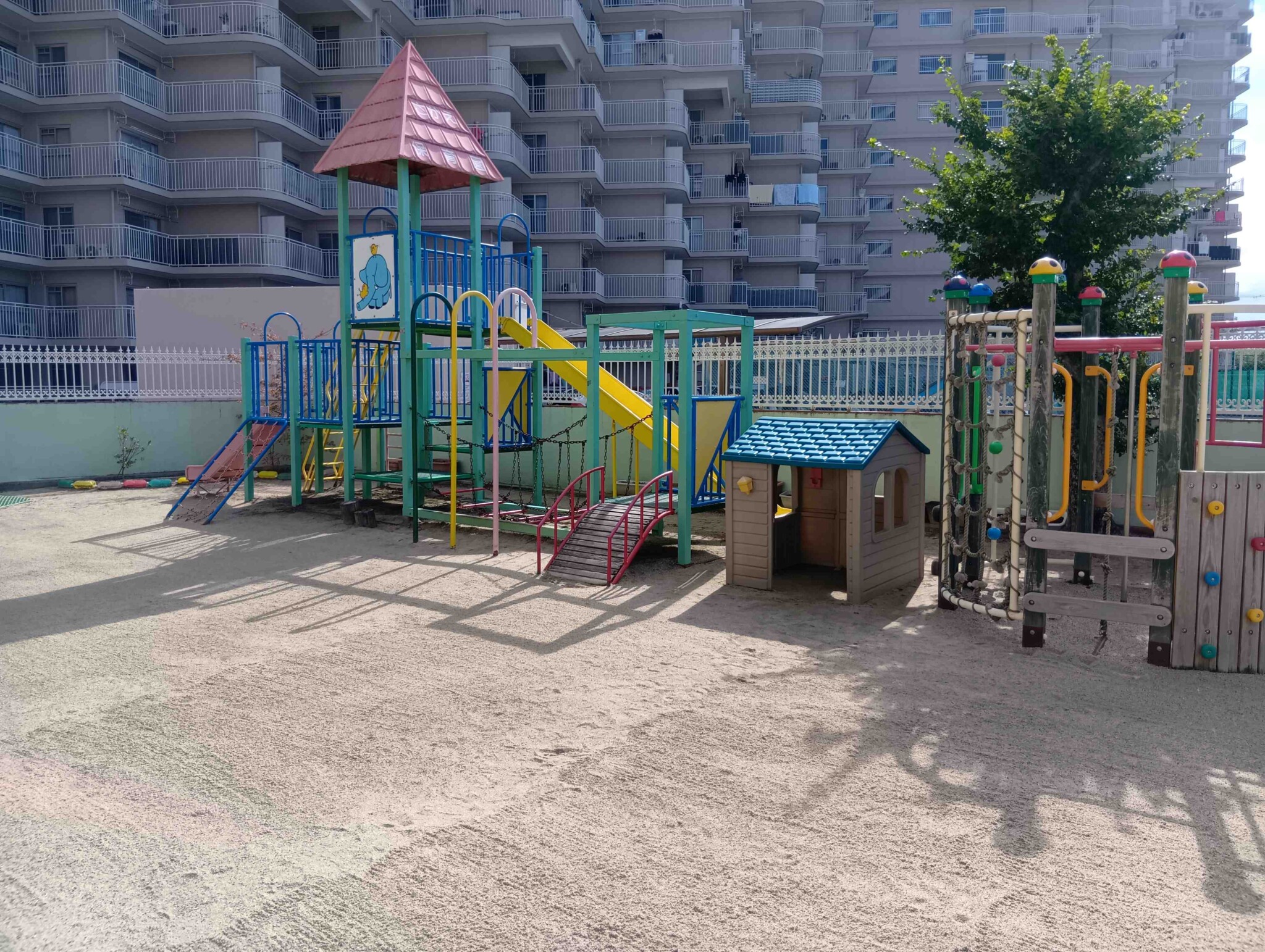 マンションの1階部分にあります。園庭も小さめですがあります。